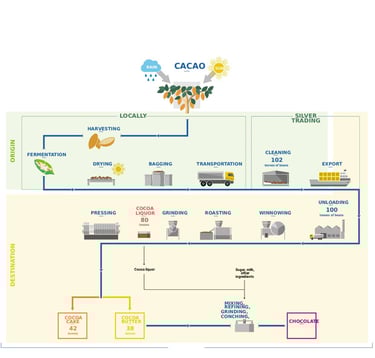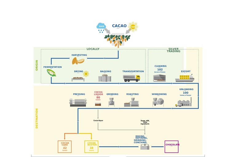 Cocoa processing begins on the farm, where pods are harvested, the beans are fermented for about seven days to develop their flavor and color, then sun-dried for around ten days. The beans are cleaned, graded, and sent to manufacturers, where they’re roasted and winnowed to separate the nibs. These nibs are ground into cocoa liquor, which is then processed into cocoa powder and cocoa butter used in chocolate, drinks, and cooking.